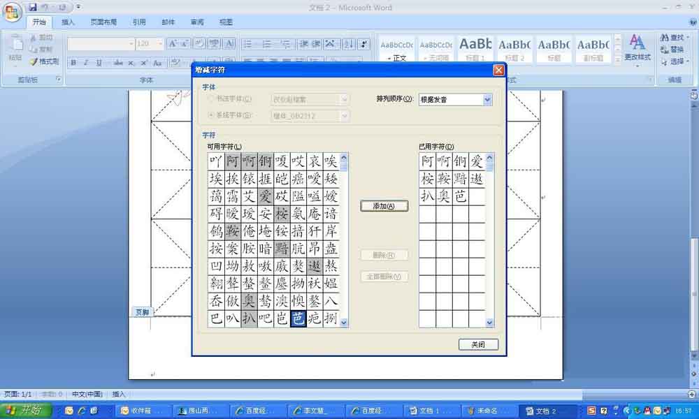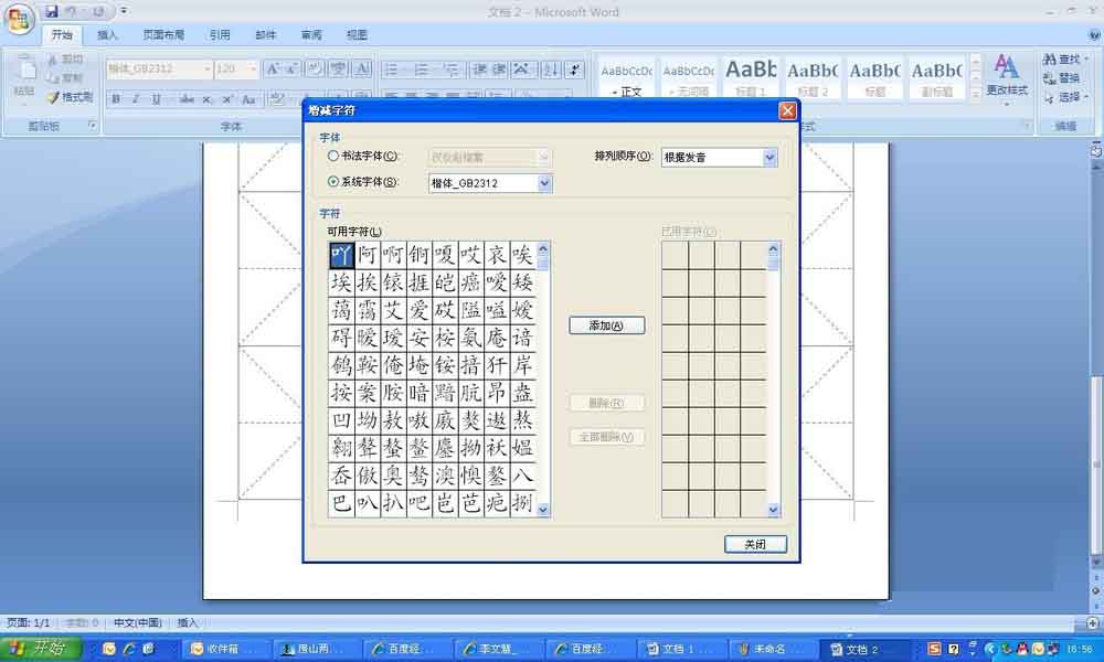 3、从弹出的字库里面选择需要的字,点击"添加",系统默认的是楷体,如果需要别的字体,可以选择"书法字体",然后从后面的下拉菜单里面找自己需要的。