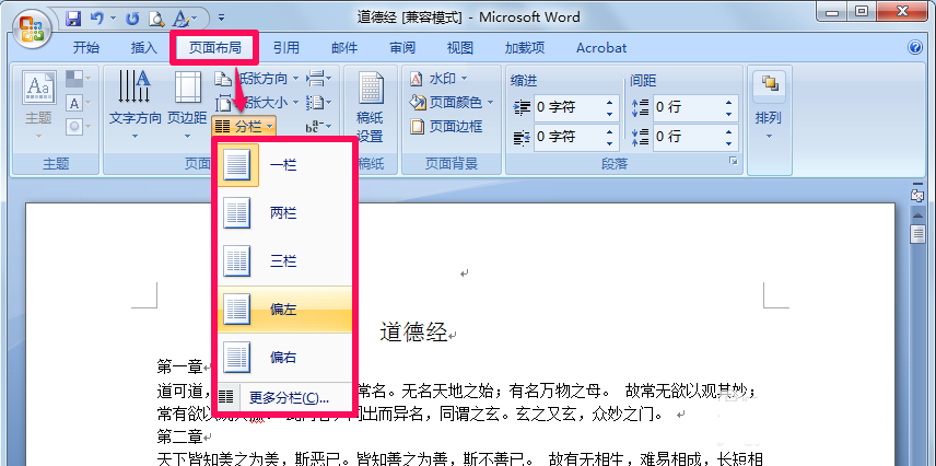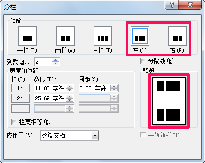 3、选择"左,右"可以使文章靠左分栏或靠右分栏,效果如图。