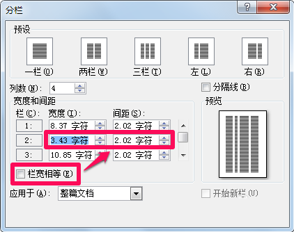 7、当取消栏宽相等时,可以在上面调节每栏的宽度和间距。比如小编分成四栏,将第二栏的宽度调小,结果如下图。