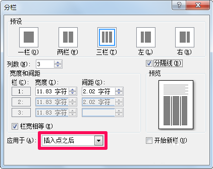 8、在下面的应用于中选择插入点之后,可以使在插入点上方的文字保持原样,在插入点下方的文字进行分栏,效果如图。