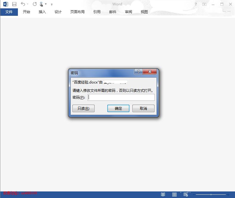 9、在我们打开上面我们设置的"修改Word文档密码"的文档时,就会弹出下面的提示框,要求我们输入密码,当别人不知道密码的时候就只能已只读的方式打开这个文件,不能修改