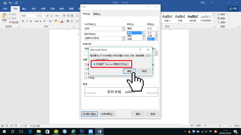 ③在弹出来的确认对话框中选择"所有基于 Normal 模板的文档(A)",再点击"确定"即完成了默认字体格式的设置。