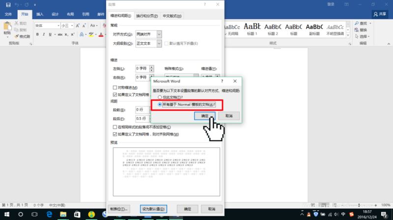 ③在弹出来的确认对话框中选择"所有基于 Normal 模板的文档(A)",再点击"确定"即完成了默认段落格式的设置。