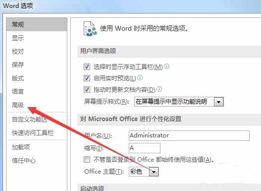3、这时会自动打开word选项窗口,点击左侧的"高级"侧边栏