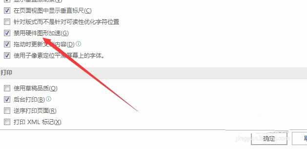 5、选中"禁用硬件图形加速"前的复选框,最后点击确定按钮,重新启动word2016后,再滚动鼠标的时候,就不会出现文字闪动的问题了