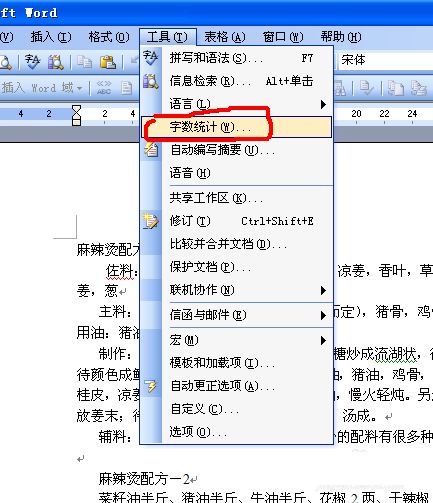 2、点击"工具"命令按钮,接着在弹出的命令菜单中找到"字数统计"命令。