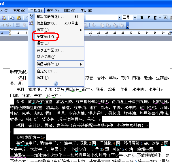 选择好之后,点击工具栏中的"工具"按钮,点击之后在弹出的下拉菜单中点击击"统计字数"命令。