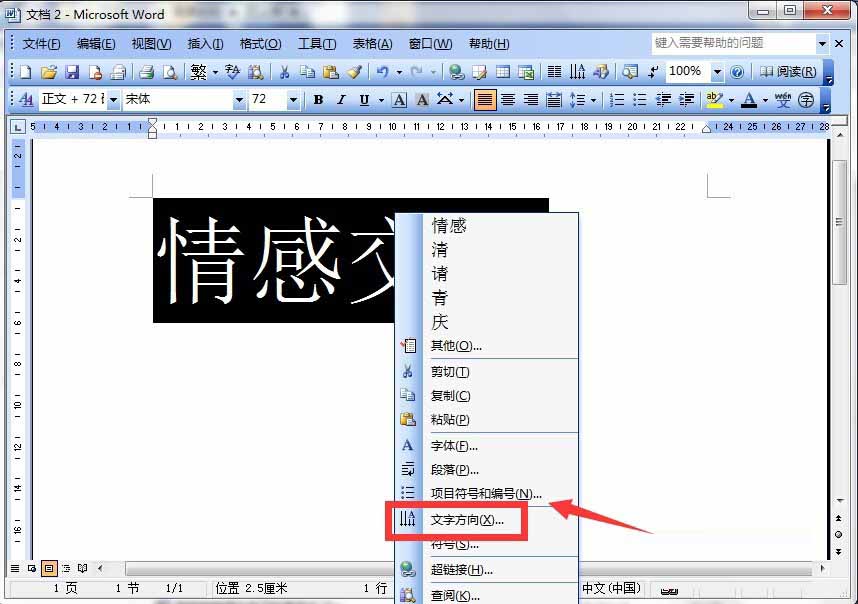 3、选中文字以后,我们需要点右键,出现了一个下来菜单,选中"文字方向",如图所示。