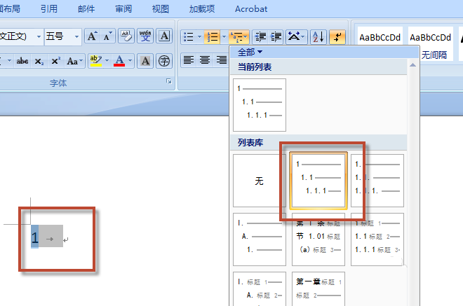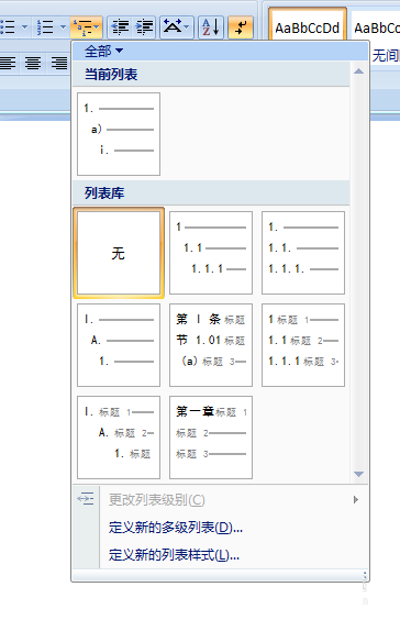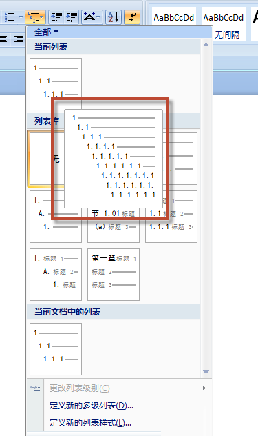 4、当确定好多级编号之后,文档中默认会出现您需要的多级编号,并且再次打开多级编号的时候,默认选择从无->您选中的编号。
