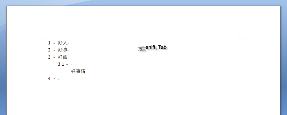 8、当您想要的是返回到更高级的编号时候,比如从3级编号到2级或者1级编号时候,按住shift+Tab即可。