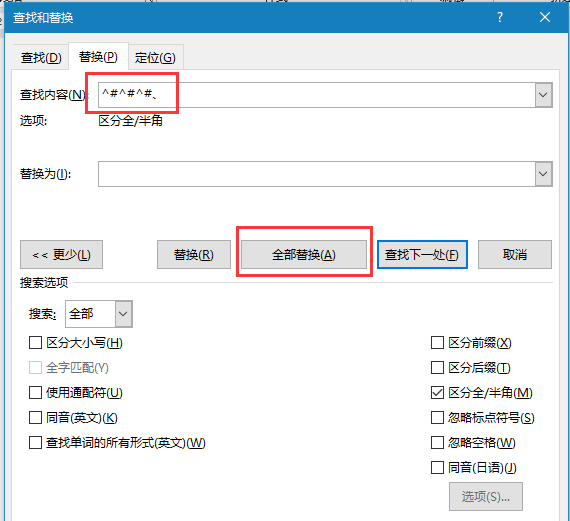 在“开始”菜单中点击“替换”,在打开的“查找和替换”窗口中点击“更多”,如下图: