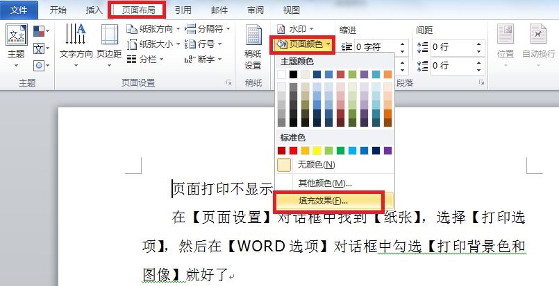 第一步:在【页面布局】菜单中选择【页面颜色】,然后选择【填充效果】,如下图: