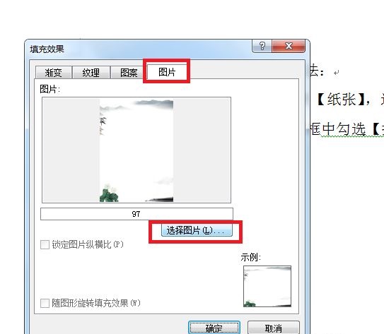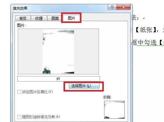 第二步:在【填充效果】对话框中的【图片】选项下,点击【选择图片】,浏览图片所在位置,选择图片插入。如下图: