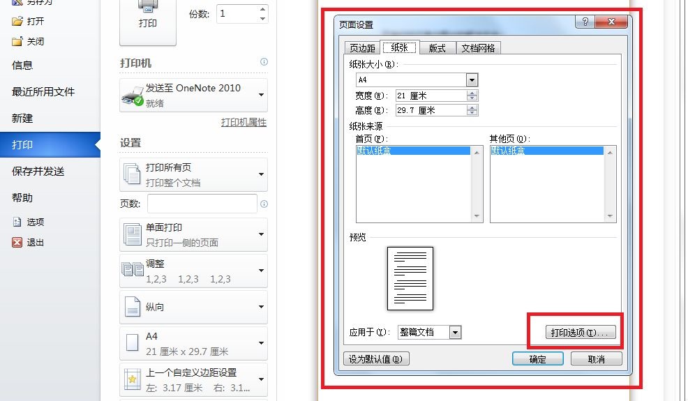 第四步:还是在【文件】菜单中的【打印】功能区,设置区下方,有【页面设置】,选择【页面设置】,在弹也的【页面设置】对话框中选择【纸张】选项卡中的【打印选项】,如下图: