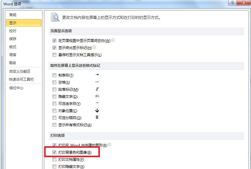 第五步:在弹中的【Word选项】中的【打印选项】中,勾选【打印背景色和图像】,如下图: