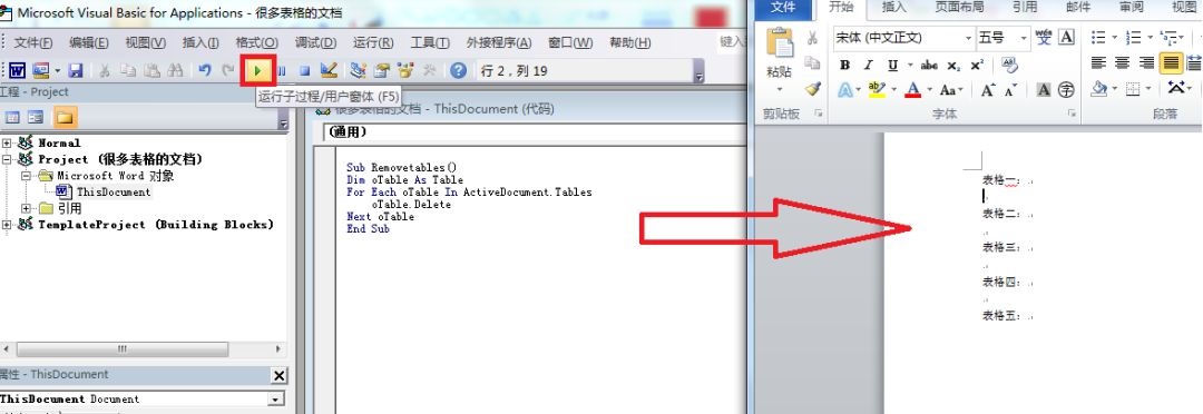 第三步:运行代码,所有的表格,不管格式如何、有无内容,都可一次删除,如下: