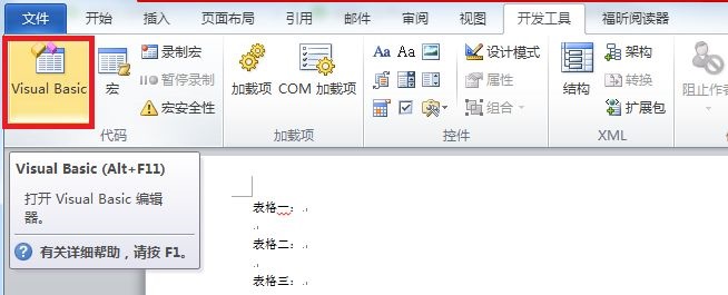 在“开发工具”菜单中,最左侧即是“visual Basic”,如下图: