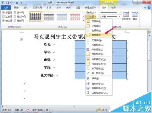 6、我们选中右边的全部表格,点击设计里面的边框,选择右框线,如图