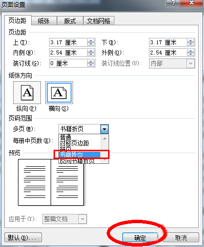 1、首先找到页面布局→页面设置(右下角红框框圈住的地方)如下图一所示,然后就会出现页面设置选框(图二),找到页边距→页码范围→多页,选择书籍折页,确定即可。