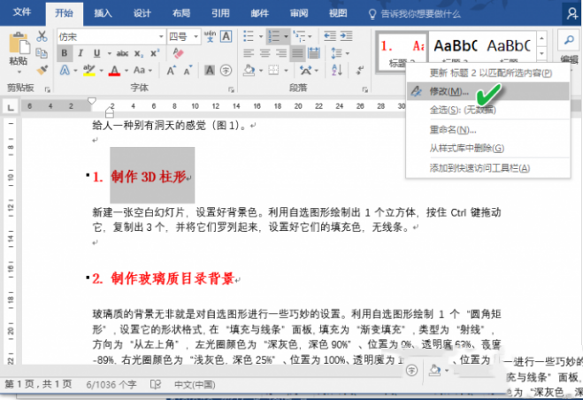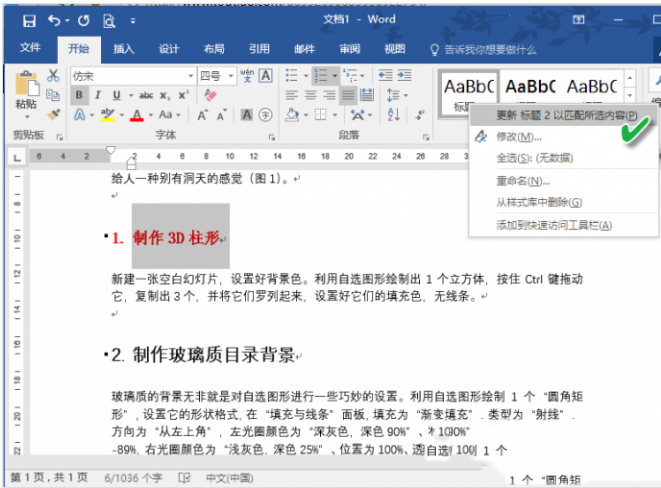 其实,我们只需在格式栏"标题2"右击,并从菜单中选择"更新 标题2 以匹配所选内容"就可以了。