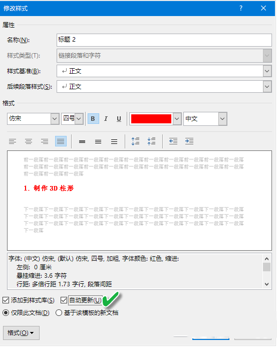 实际上,以上更新过程的自动化程度还可以进一步提高。如果在标题2的右键菜单中选择"修改"选项,在接下来弹出的"修改样式"窗口中选中"自动更新"复选框,那么当修改了文中标题1的格式之后,与之关联的后续标题样式将自动实现更改,也就不用去手动更新样式了。