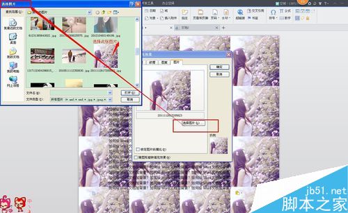 4、如图所示,点击"图片"之后将会出现"填充效果",点击"选择图片",选择你自己喜欢的图片,但建议图片的选择尽量清新淡雅,如为保护眼睛,可以选择黄色或者是蓝色的图片,不宜选择过于花哨的图片,备注:简介所展示几张背景图片,仅为展示效果,并不适合做背景图片,请勿仿效!