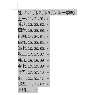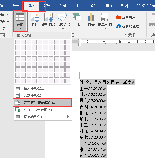 将要转换为表格的文本选中,选择“插入——表格——文本转换成表格”: