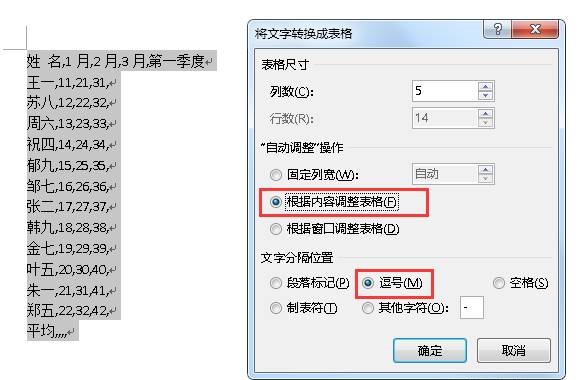 表格的列数,会根据“逗号”隔开的内容自动默认;自动调整操作选择“根据内容调整表格”;文字分隔位置选择“逗号”,点击确定: