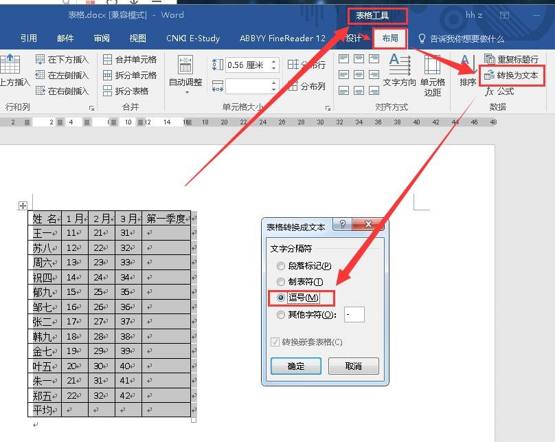选中表格,在“表格工具”浮动栏中选择“布局”选项卡下的“数据”功能区的”转换为文本”,选择文字分隔符“逗号”: