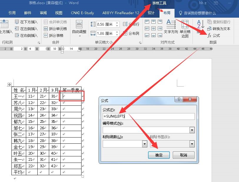 将光标置于要输入”第一季度”合计值的单元格中,选择“表格工具”浮动栏中的“布局”选项卡中,在“数据”组中单击“公式”按钮,打开“公式”对话框,此时在”公式“”文本框中自动显示公式“=SUM(LEFT)”: