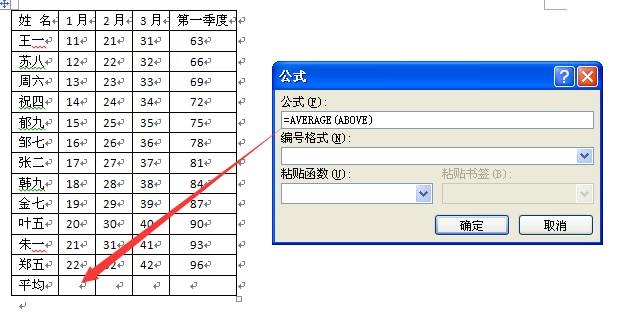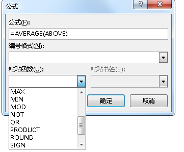 将光标置于要输入”1月”平均的单元格中,选择“表格工具”浮动栏中的“布局”选项卡中,在“数据”组中单击“公式”按钮,打开“公式”对话框,此时在”公式“”文本框中自动显示公式“=AVERAGE(ABOVE)”: