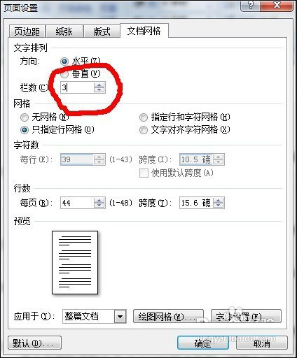 4、在弹出来的"页面设置"对话框里点击"文档网格",把"栏数"改为3格,然后点确定。