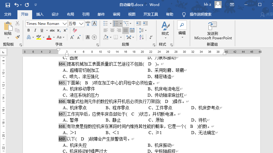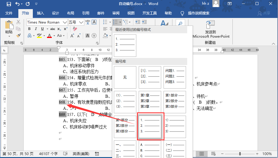 4、选择”开始“菜单中的”自动编号“中的编号,即可给每一题目添加自动编号 (也可以自己定义编号格式),如下图: