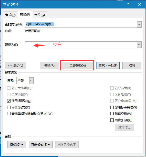 5、在”查找与替换“窗口中”替换“选项卡中查找内容为“<[0123456789]@.”,替换为空白,点击”全部替换“,如下图: