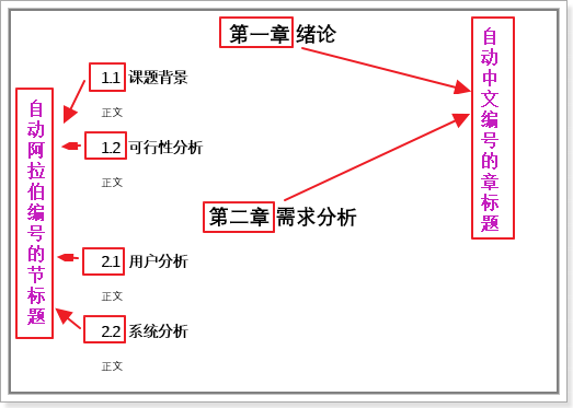 在Word 生成中文编号的一级章标题一文中,曾经了如何生成中文编号的章标题,以及阿拉伯数字的节标题,结果如下:
