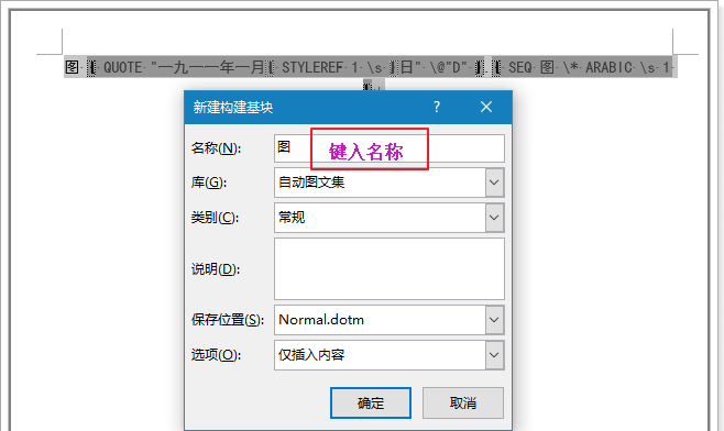 全选上段代码,按组合键,会弹出【新建构建基块】,把这段代码保存为名称为“图”的自动图文集,确定,如下图: