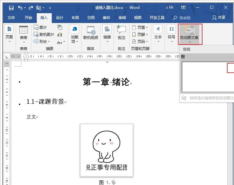 鼠标定位在图的下方,在菜单中的【自动图文集】,即可看到上一步新建的自动图文集,选中插入即可,如下图: