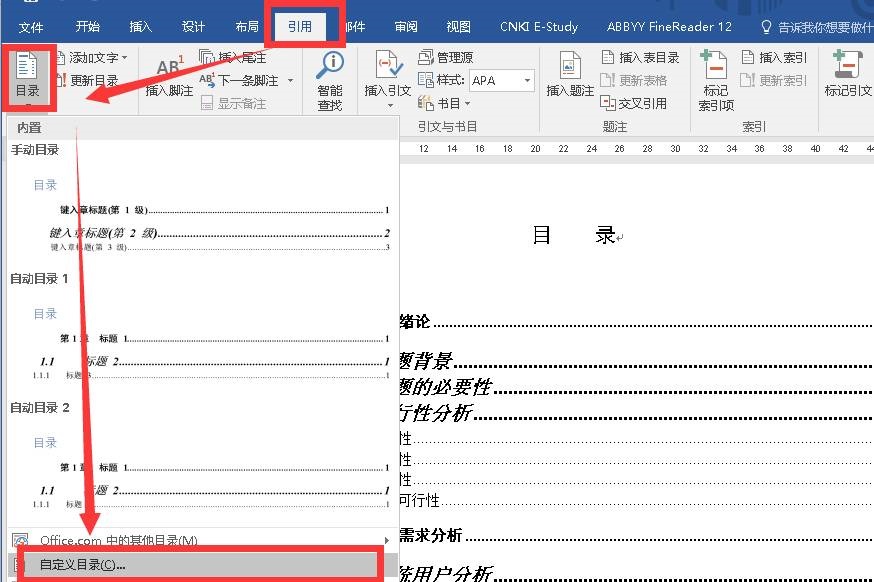 修改目录,必需选择“引用——自定义目录”,打开“目录”窗口进行修改: