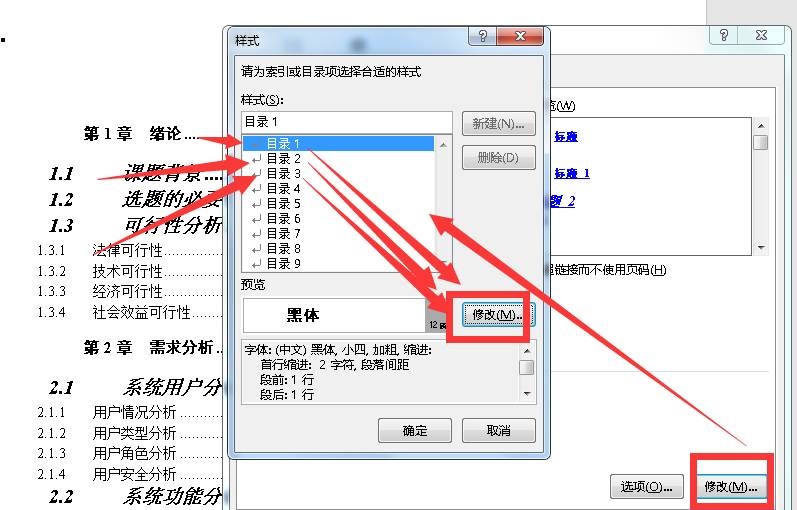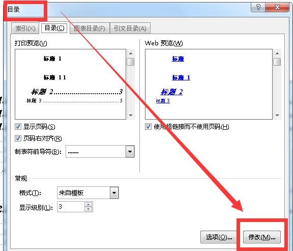 标题1、2、3分别对应目录1、2、3,修改哪个级别的标题就是选中哪个级别的目录,点击“修改”: