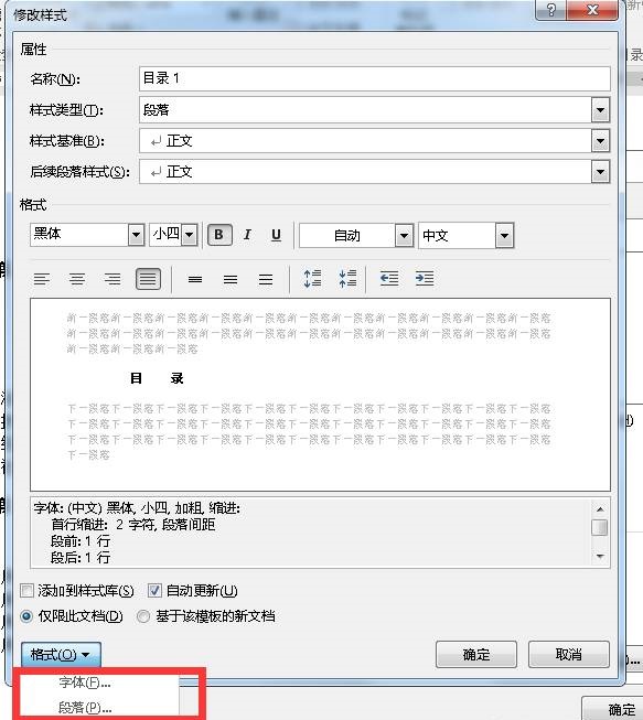 修改好对应级别目录的“字体”和“段落”,如有需要,还可以修改其它格式: