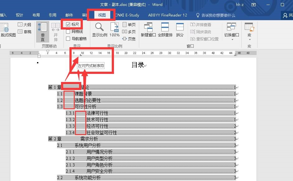 字体和段落等格式修改好以后,如果各级标题编号与内容之间的间隔特别大,可以打开“视图——标尺”,利用拖动“左对齐式制表符”来调整编号与内容之间的间隔大小: