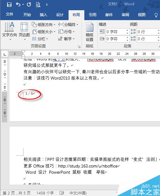 但是,细心的你可能已经发现,页码的总数没有减去封面的1页,最后一页的页码变成了4/5,那么5/5这页哪里去了?这好像有点不合乎逻辑。如何更正呢?我们只需选中页脚页码区域 1/5 的5数字,鼠标右键单击,选择"编辑域",然后将"Numberpages"改为"Sectionpages"。