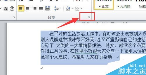 1、打开word文档之后,对需要调整的内容进行选择之后,再点击"开始"菜单工具栏中段落页面右下降的"向下箭头"图标。(如下图)