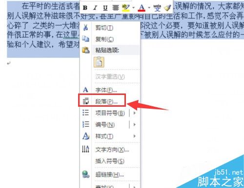 1、在打开的word文档中,对需要调整行距的内容全选之后,再点击鼠标右键,在弹出来的选项菜单中,选择"段落"。(如下图)