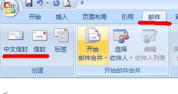 2、在工具栏中找到邮件选项,然后进入邮件选项的界面,然后选择中文信封。