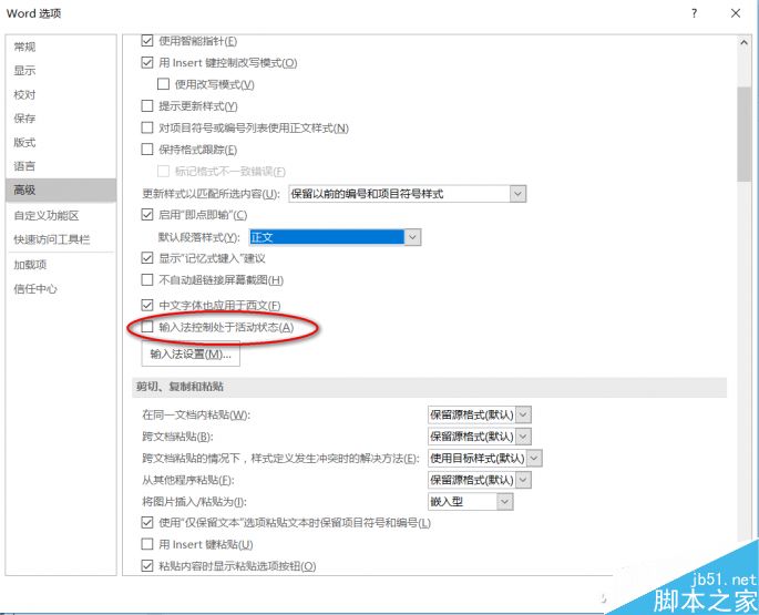 在Word选项窗口中,点击左侧"高级"选项,在右侧窗格中可见"输入法控制处于活动状态"选项处于被选中状态,这时只需将选择框中的对勾取消掉,就可以解决输入法无法切换的问题了。