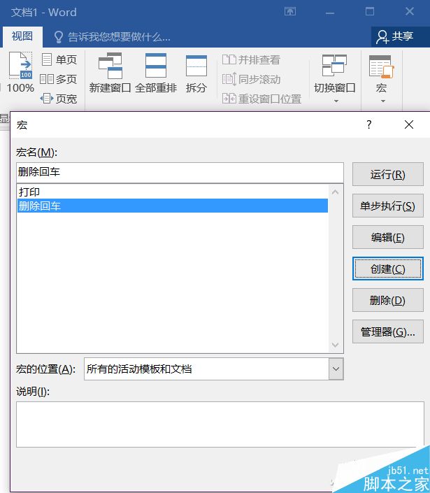 在Word文档中,切换到视图页面,点击最左侧的"宏",在弹出窗口内,输入一个名字,比如删除回车之类的,然后点击"创建"。