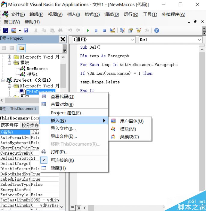 在弹出的Visual Basic for Applications界面中,右键单击左侧栏"Project(文档1)—Microsoft Word对象",选择"插入"中的"模块"。