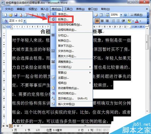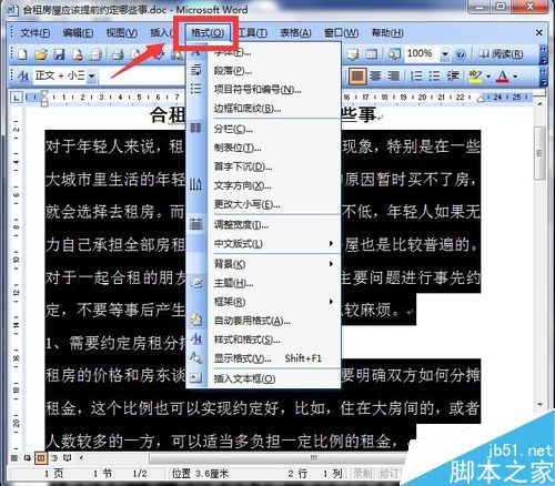 3、选中文字以后,点击word文档上方的菜单项中的"格式",会弹出一个下拉菜单,如图所示。