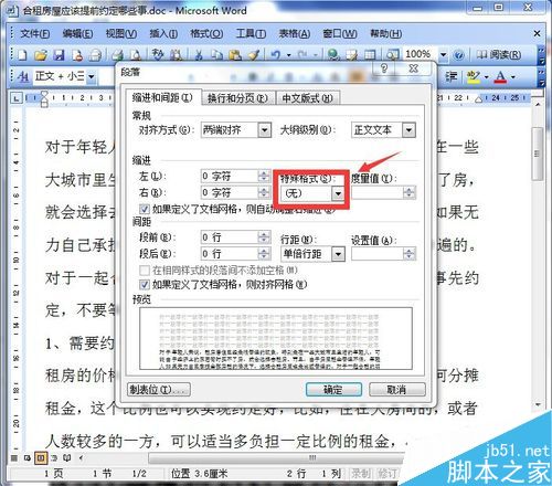 5、点击段落以后,弹出了一个对话框,我们找到其中的"特殊格式",点击他右面的倒三角,如图所示。